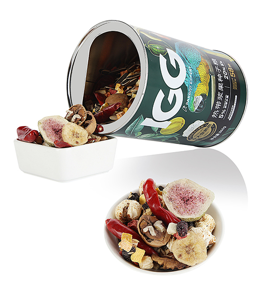 加纳利子、花生仁、大葵花籽、带壳荞麦、带壳南瓜籽、浓缩营养颗粒(贝壳粉、螺旋藻、啤酒酵母粉、蛋黄粉、亚麻籽油、蜂蜜、苜蓿草、磷虾粉、海藻粉、柠檬皮、橙皮、蒲公英叶、肉桂、丝兰提取物)、带壳大米、带壳碎核桃、燕麦片、玉米粒、玉米片、有机小麦仁、大麦仁、大玉米碎、榛子仁、红花籽、高粱、开口生松子、干辣椒、冻干蓝莓果、冻干胡萝卜、冻干无花果、香蕉干、葡萄干、玉米爆米花、冻干芒果、冻干木瓜、冻干桑葚、冻干草莓、冻干苹果、冻干南瓜。